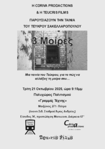 Την Τρίτη (9:15μμ) 21 Οκτωβρίου 2025 στο θέατρο “Γραμμές Τέχνης” στην Πάτρα θα προβληθεί η μεγάλου μήκους ταινία μου “3 Μοίρες”.